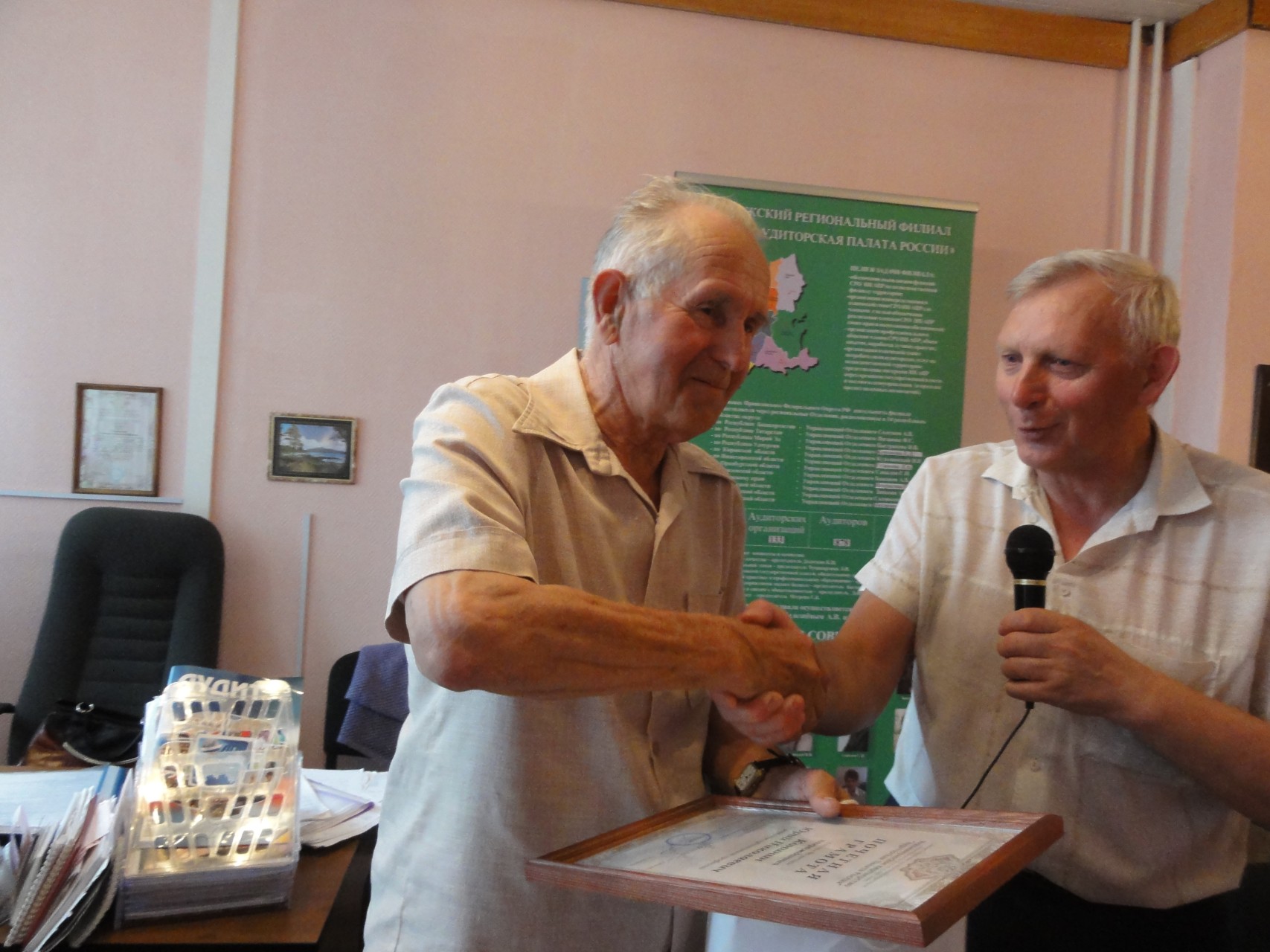 Перед началом заседания Круглого стола Председатель Совета ПРФ СРО НП АПР вручил Почетную грамоту СРО НП Аудиторская Палата России за вклад в развитие аудиторской профессии и в связи с 80-летием со дня рождения старейшему аудитору в Республике Башкортостан, настоящему профессионалу своего дела, Конинину Юрию Николаевичу.